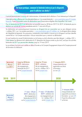 Pour les heures de bénévolat de 2017, le CEC permettra une utilisation des budgets de formation au 1er trimestre 2019 et pour les heures de bénévolat de 2018, les demandes de formation seront possibles à partir du 1er trimestre 2020.